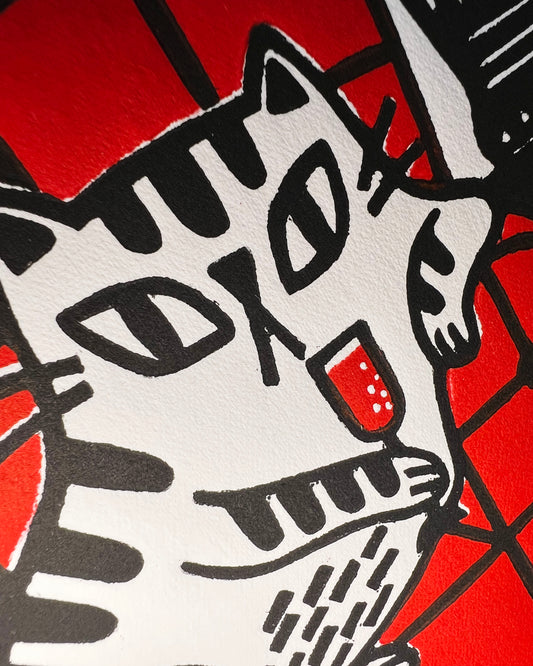 Cat Handmade Linocut Art Print - Thursday Wine and Relax