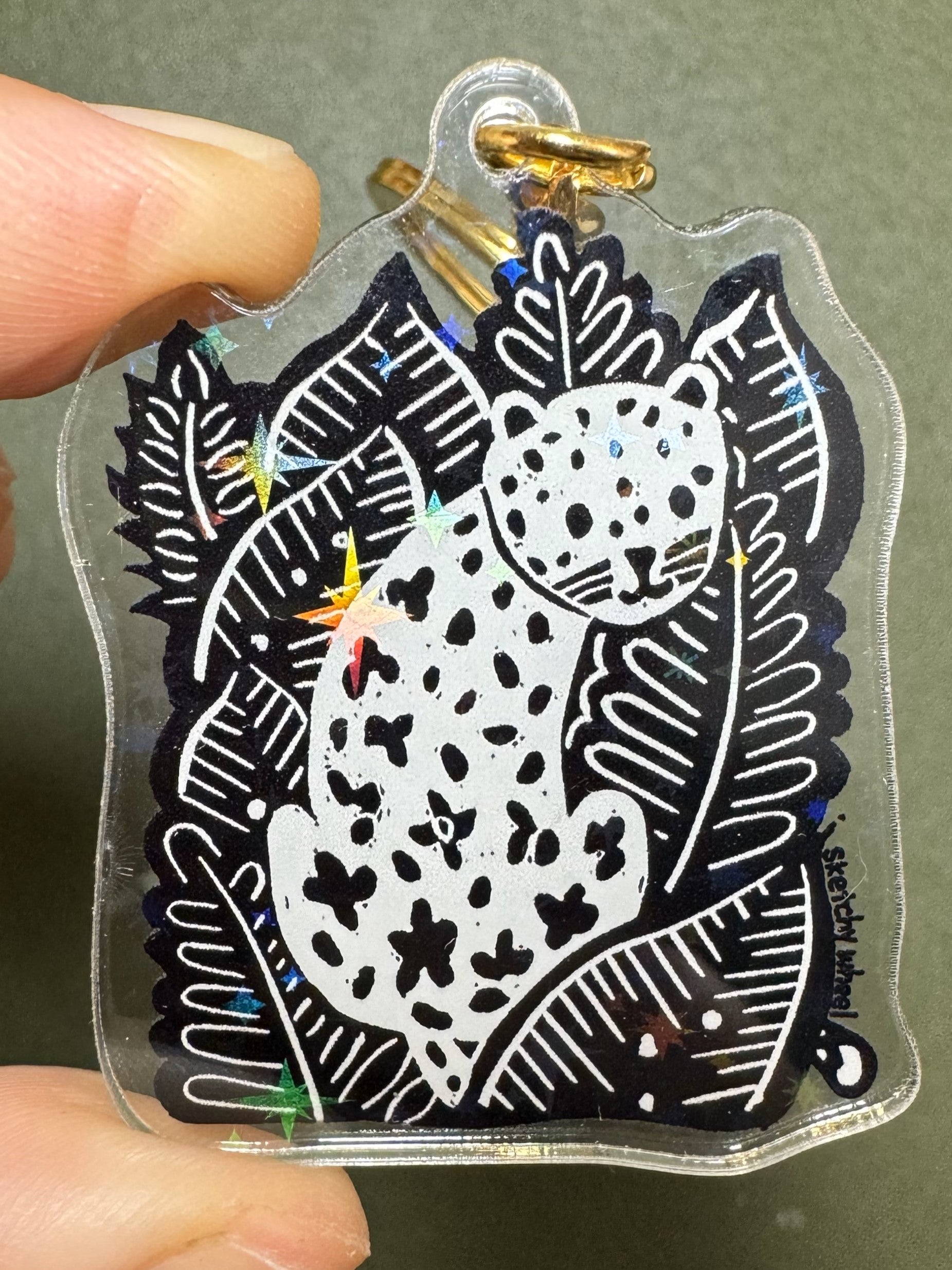 Double-sided 2 inch acrylic keychain with subtle glitter on the front. Gold hardware.