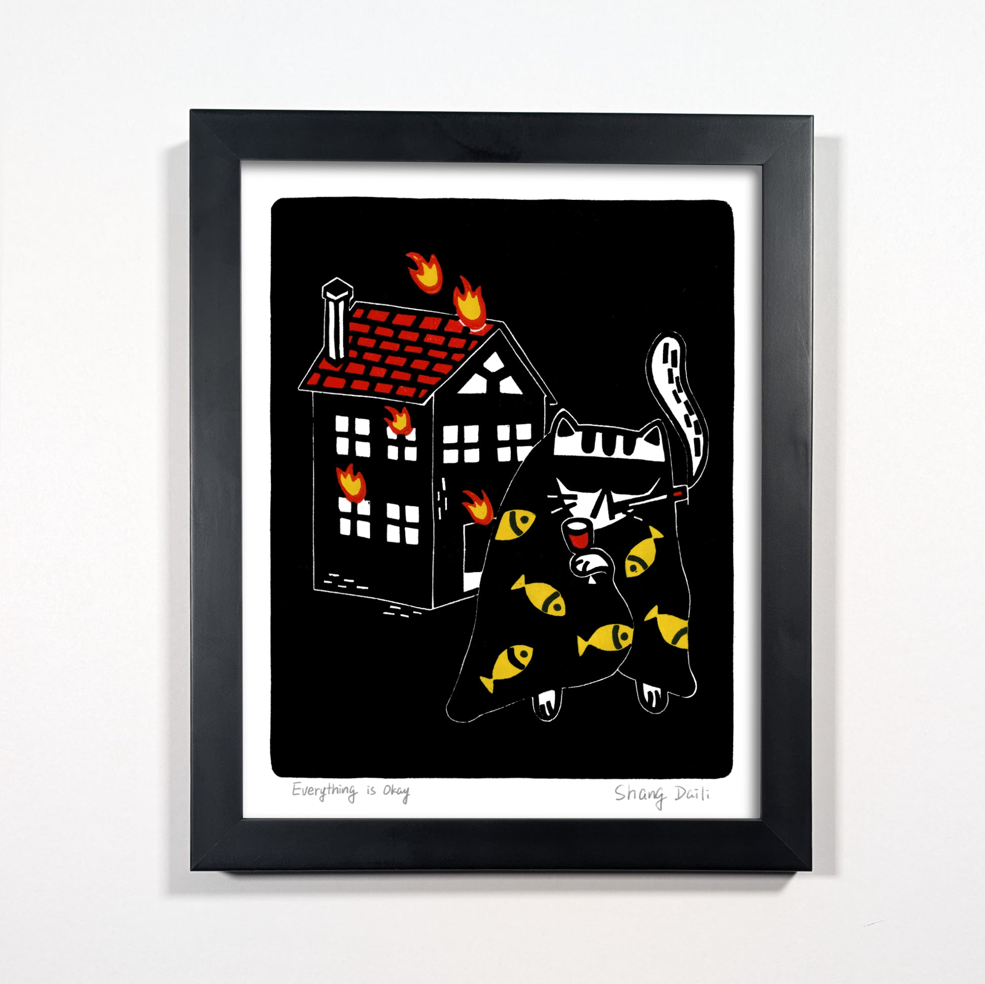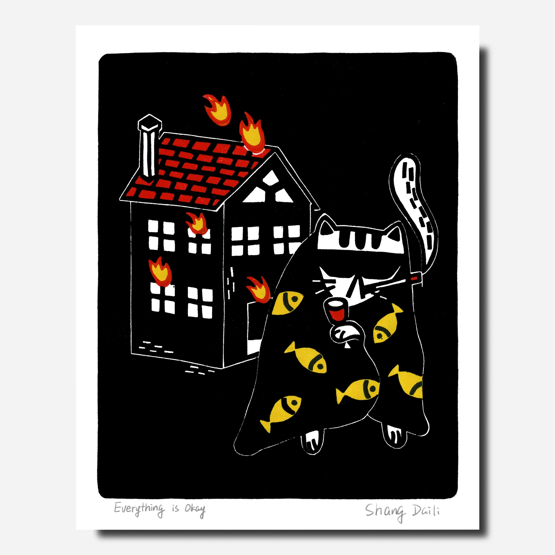 Cat in front a burning house holding a wine with a cigarette. Everything is fucked. Everything is fine.